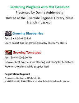 Discover best practices for planting and caring for tomatoes from Donna Aufdenberg, Horticulturalist with MU Extension. Free tomato plants while supplies last! Contact Robbie at 573-243-8141 or visit the Main Branch in Jackson to register. For ages 18+.