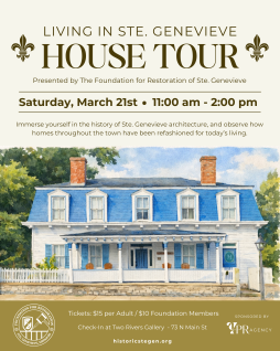 Tour check in is 11 am to Noon at Two Rivers Gallery, 73 N. Main St. Not all homes are accessible. Please contact the Foundation at 573-883-9622 with any questions.