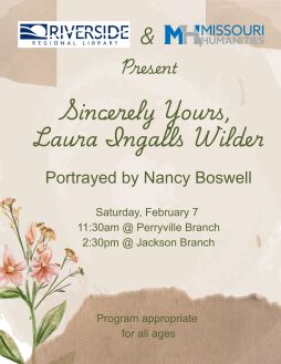 Riverside Regional Library in Perryville will present "Sincerely Yours, Laura Ingalls Wilder" on February 7.
