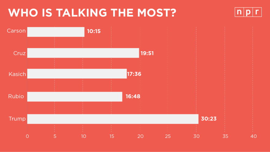By NPR's count, Trump got by far the most talking time, with more than half an hour. The next-closest candidate, Cruz, was more than 10 minutes behind him.