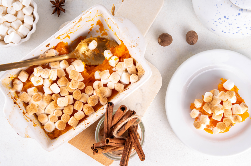 For the best sweet potato anything—candied, in a casserole, roasted, mashed, or as a southern tradition in a pie or biscuits—use fresh ones as they are in abundance. You want to use the Covington variety for those if you can.
